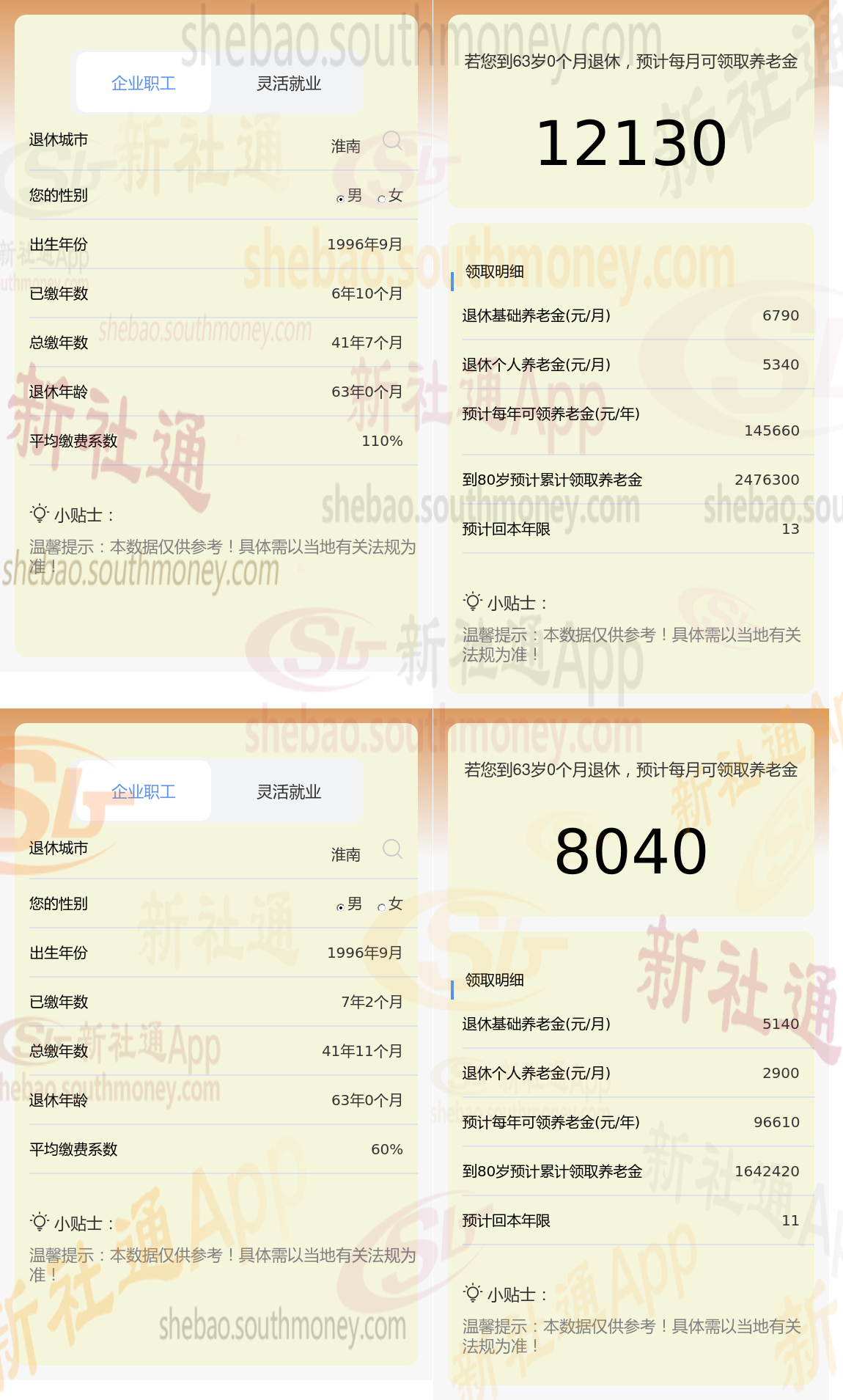下面社保网-APP一起来看下,以淮南为例(不考虑过渡养老金):