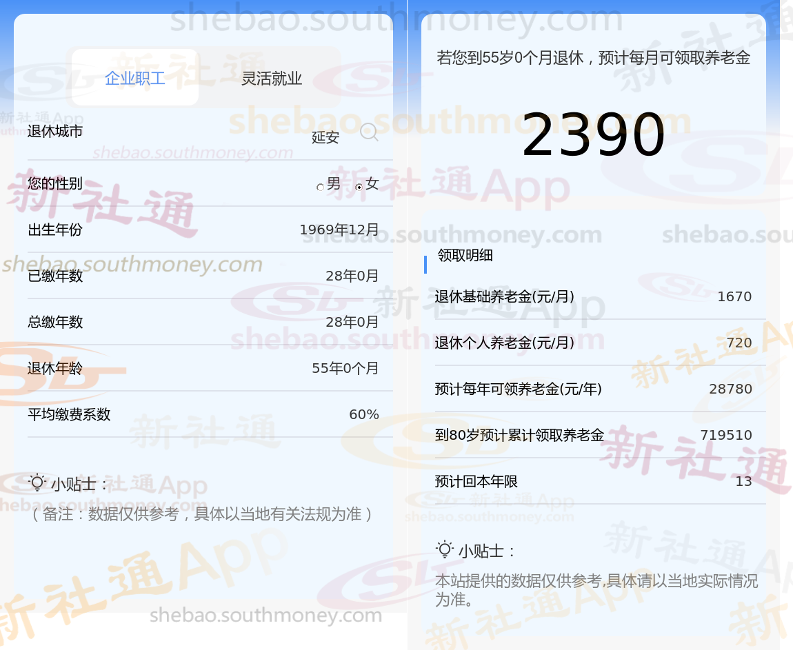 亲戚朱某退休城市在延安,性别:女,出生年份:1969,总缴年数28年,缴费档次:60%,新社通app养老金计算器所得: