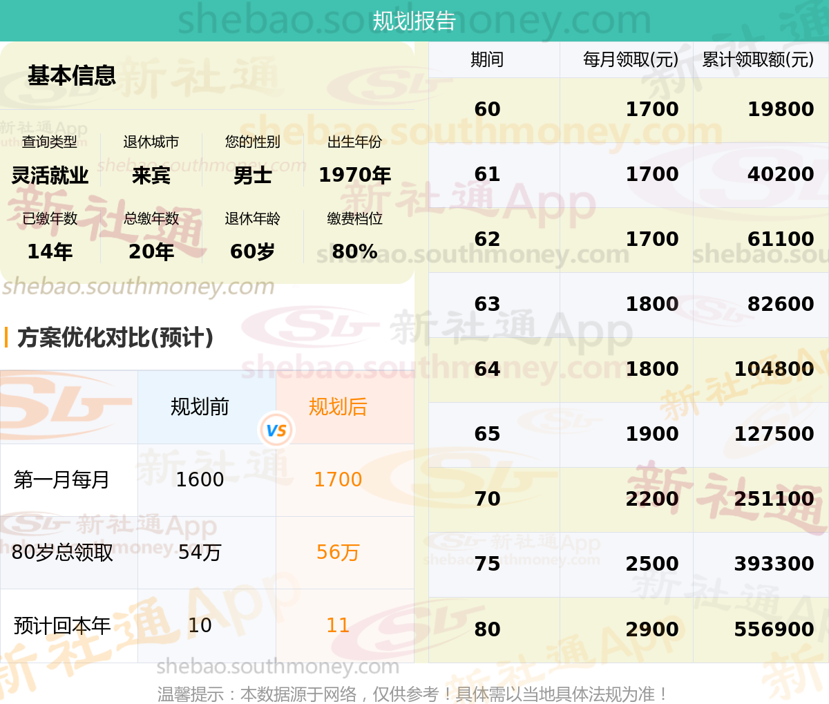 规划前:60岁第一个月约领1600元,新社通APP-养老金规划后:60岁第一个月约领1700元