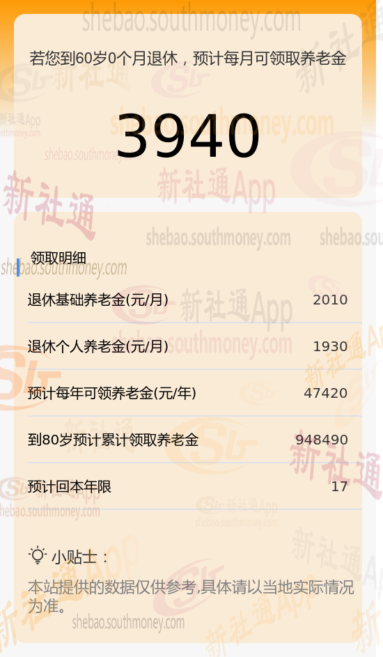 总养老金月度领取额:将基础养老金和个人养老金相加,得出每月可领取的养老金总额大约为3940元(即2010元基础养老金+1930元个人养老金)。