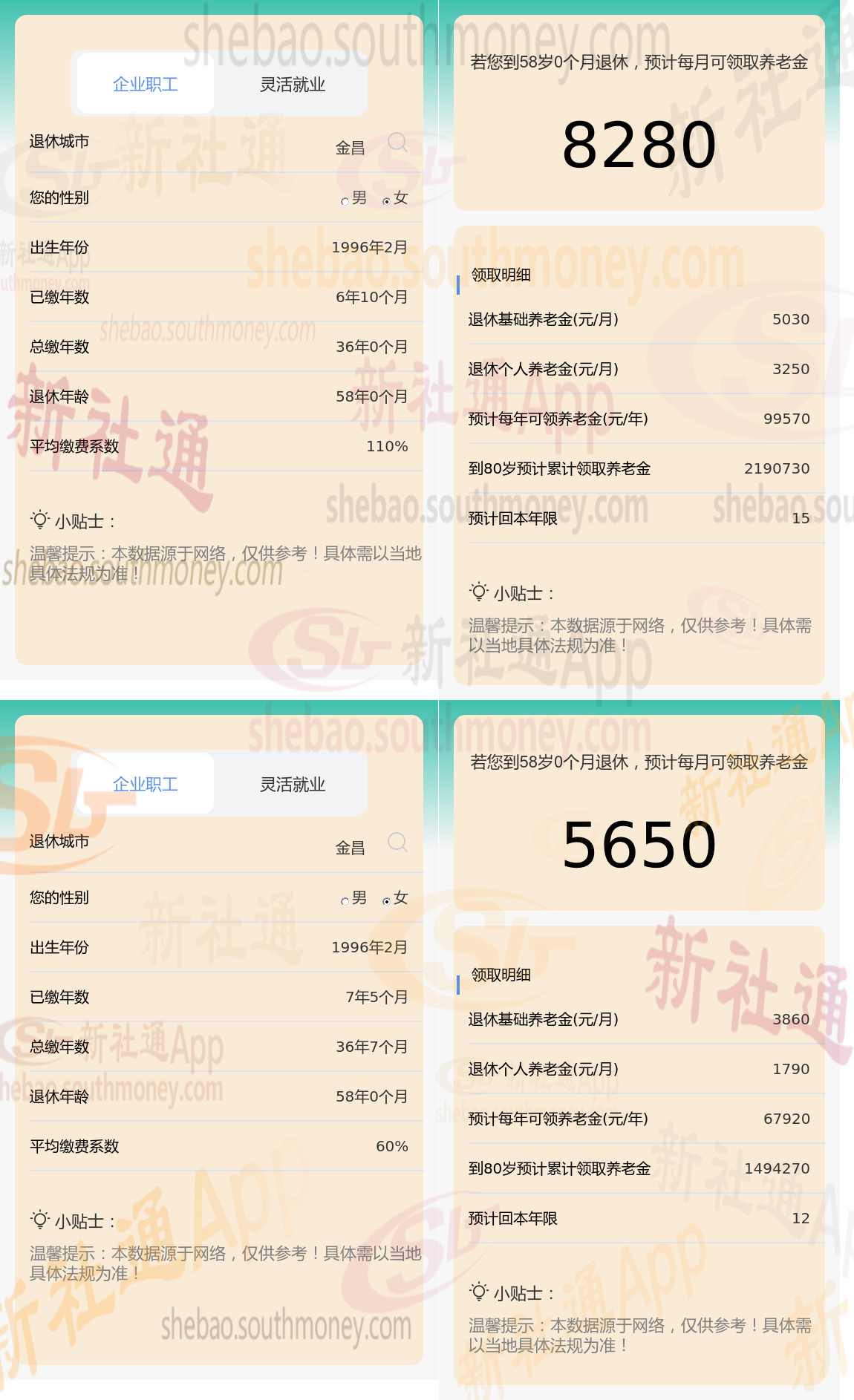 根据新社通app养老金计算器,轻松测算您的养老金!计算所得出:上班族与朱某的差别,缴费年限、缴费档位不同的情况下,差别8280-5650=2630元。