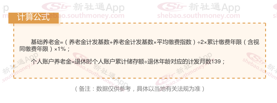 ①基础养老金部分,等于退休上年度社会平均工资×(1+本人平均缴费指数)÷2×缴费年限×1%。