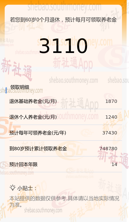 新社通app养老金计算器所得出,每月领取3110元养老金。