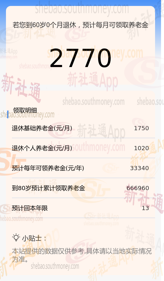 总养老金金额:两者合计,您每月可领取的养老金总额为2770元/月。