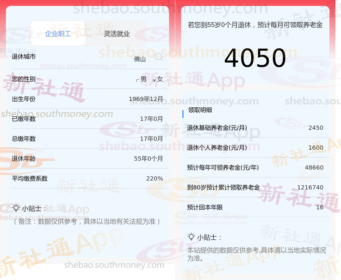 刘某,一位1969年出生的女性,现已在佛山退休的情况,他的养老保险详情及预计养老金计算如下: