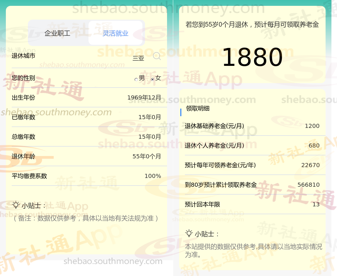 沈某,女,1969年出生,现居三亚并已退休。其养老保险缴纳情况如下:总缴费年限为15年,缴费档次达到100%。根据新社通app养老金计算器的估算结果: