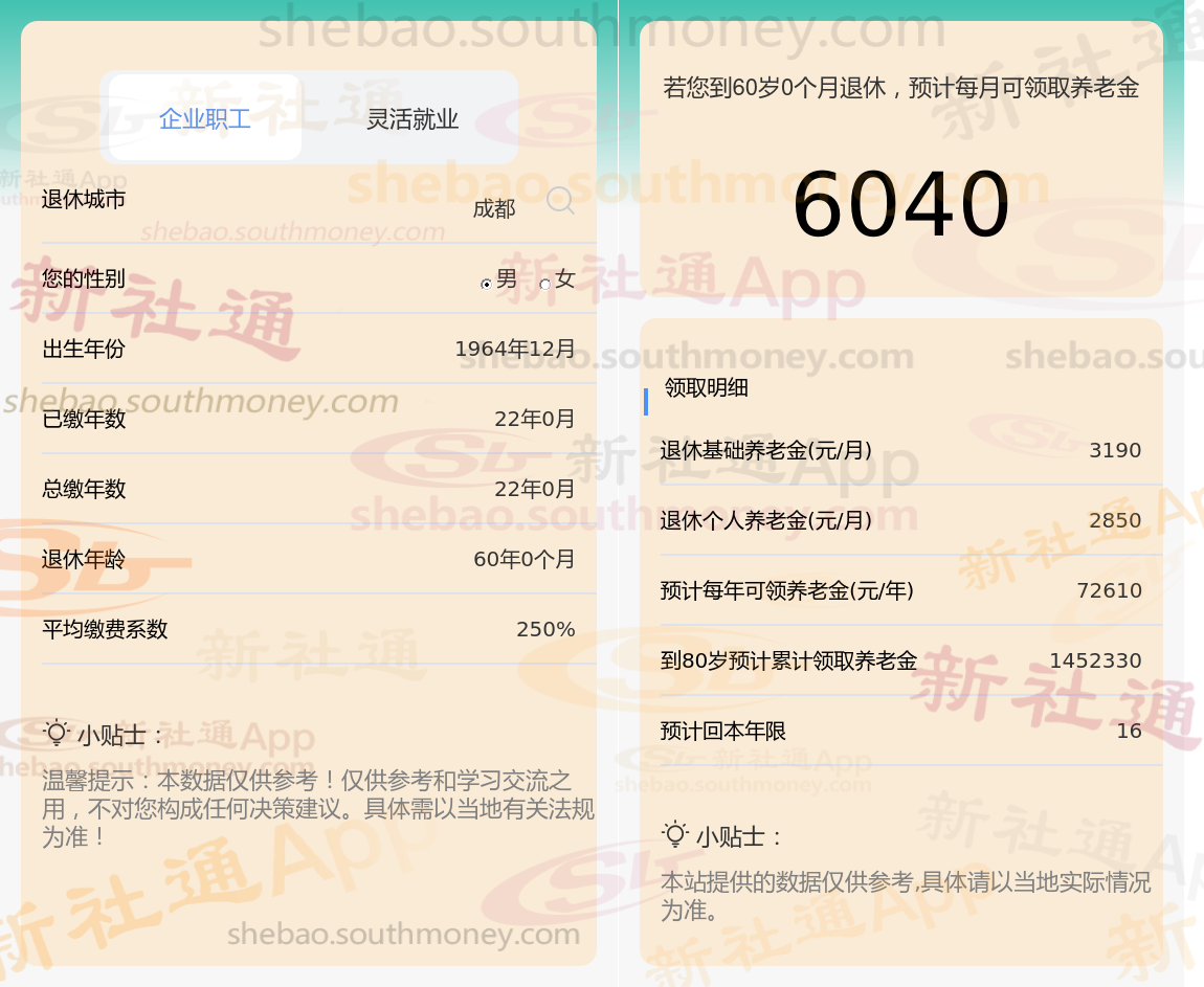 新社通app养老金计算器所得出,每月领取6040元养老金。