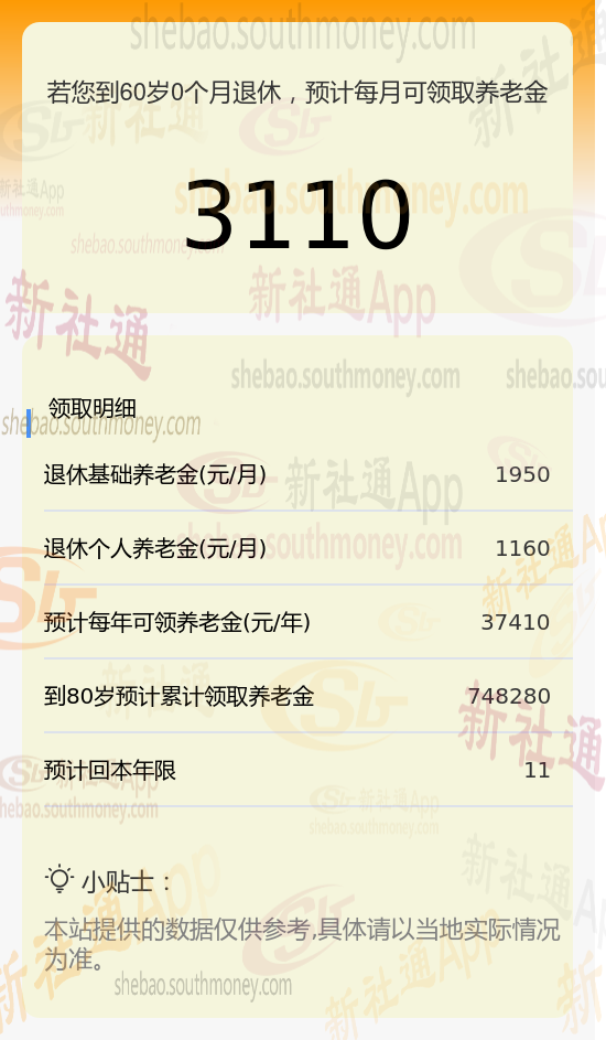 新社通app养老金计算器所得出,每月领取3110元养老金。