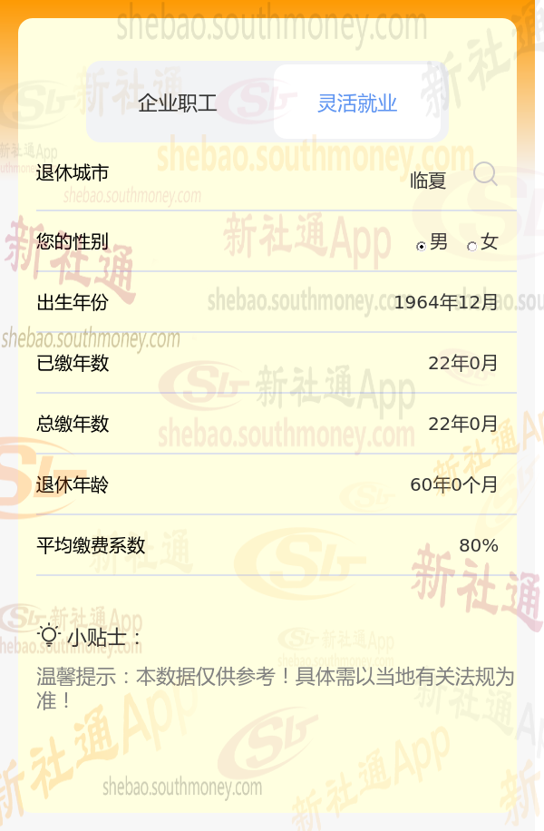 退休城市:临夏,性别:男,出生年份:1964,总缴年数22年,缴费档次:80%为例,新社通app养老金计算器预设工资增长率等参数为3%。在此情境下,其退休后能领取的养老金数额需通过计算器精确得出,但基于上述条件,预计数额会相对较低。为获准确估算,建议秦某使用计算工具按要求输入个人信息进行计算,具体数额依个人情况及当地法规而定。