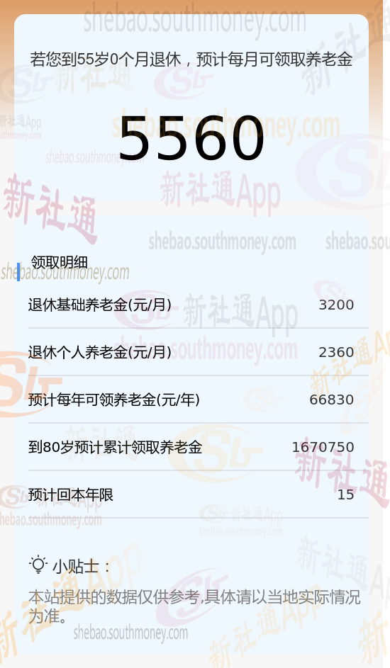 结果显示:他每月可以从个人账户中领取约2360元的养老金。将上述两部分相加,我们得出秦某每月预计可以领取的养老金总额为5560元。这一结果是由新社通app养老金计算器基于给定的参数和公式得出的估算值。