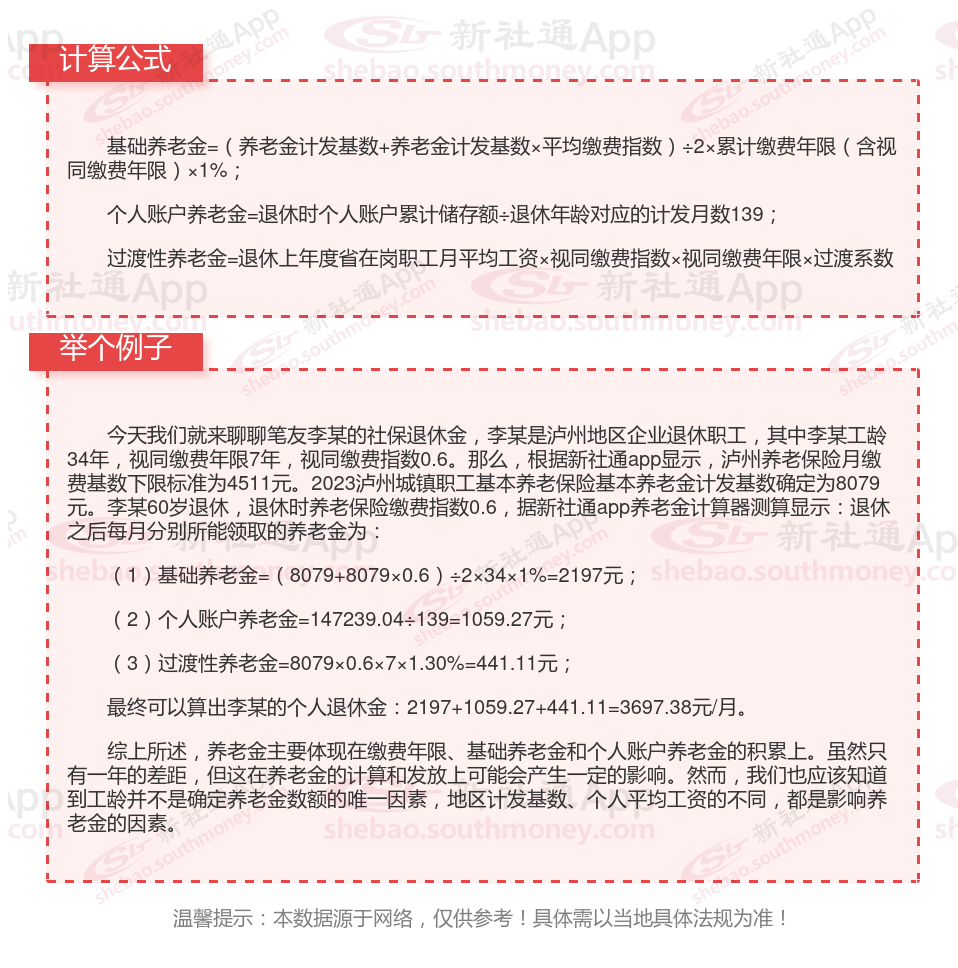 基本养老金=基础养老金+个人账户养老金+过渡性养老金=退休前一年全市职工月平均工资×20%(缴费年限不满15年的按15%)+个人账户本息和÷120+指数化月平均缴费工资×1997年底前缴费年限×1.4%。
