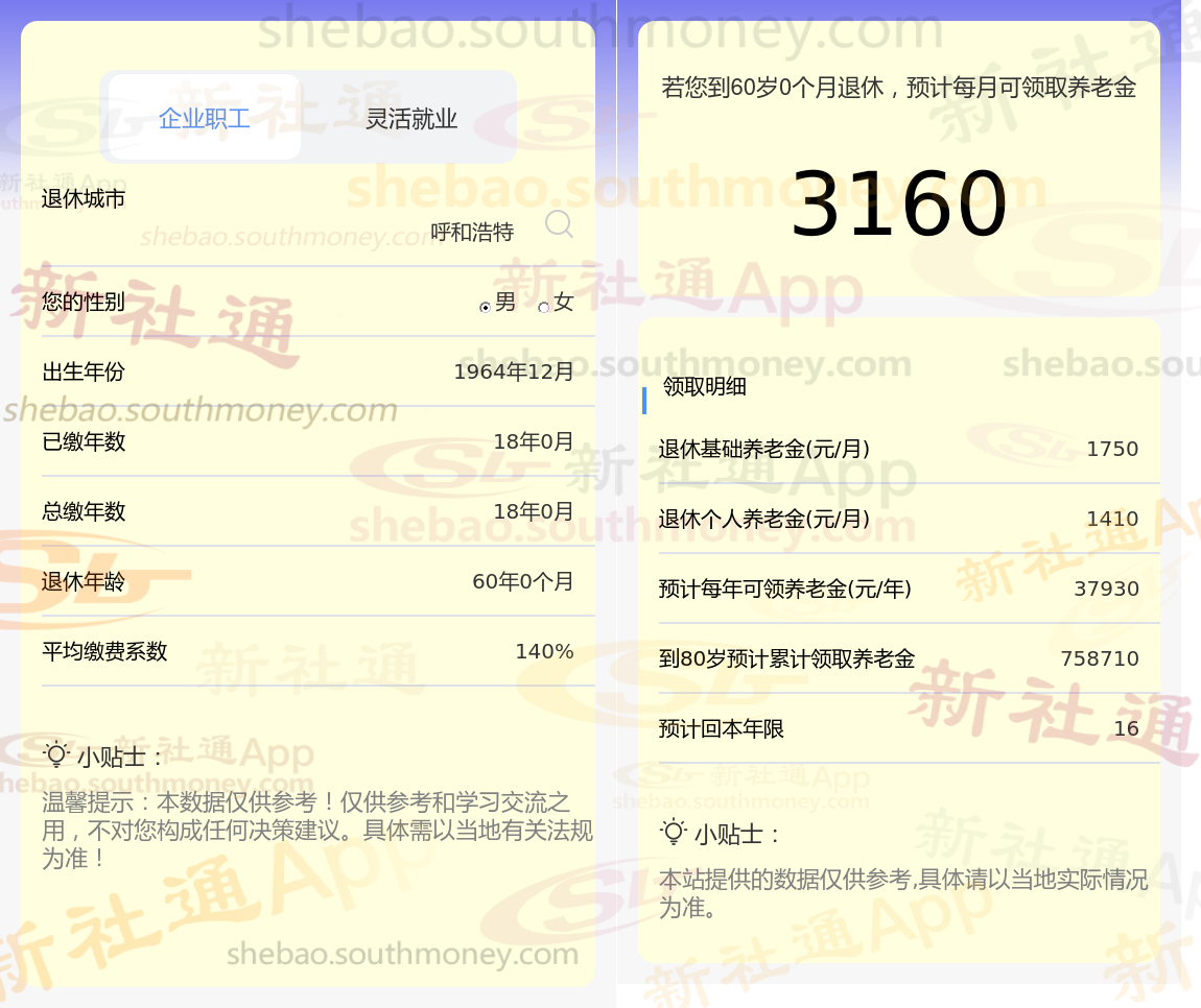 退休城市:呼和浩特,性别:男,出生年份:1964,总缴年数18年,缴费档次:140%,新社通app养老金计算器所得:
