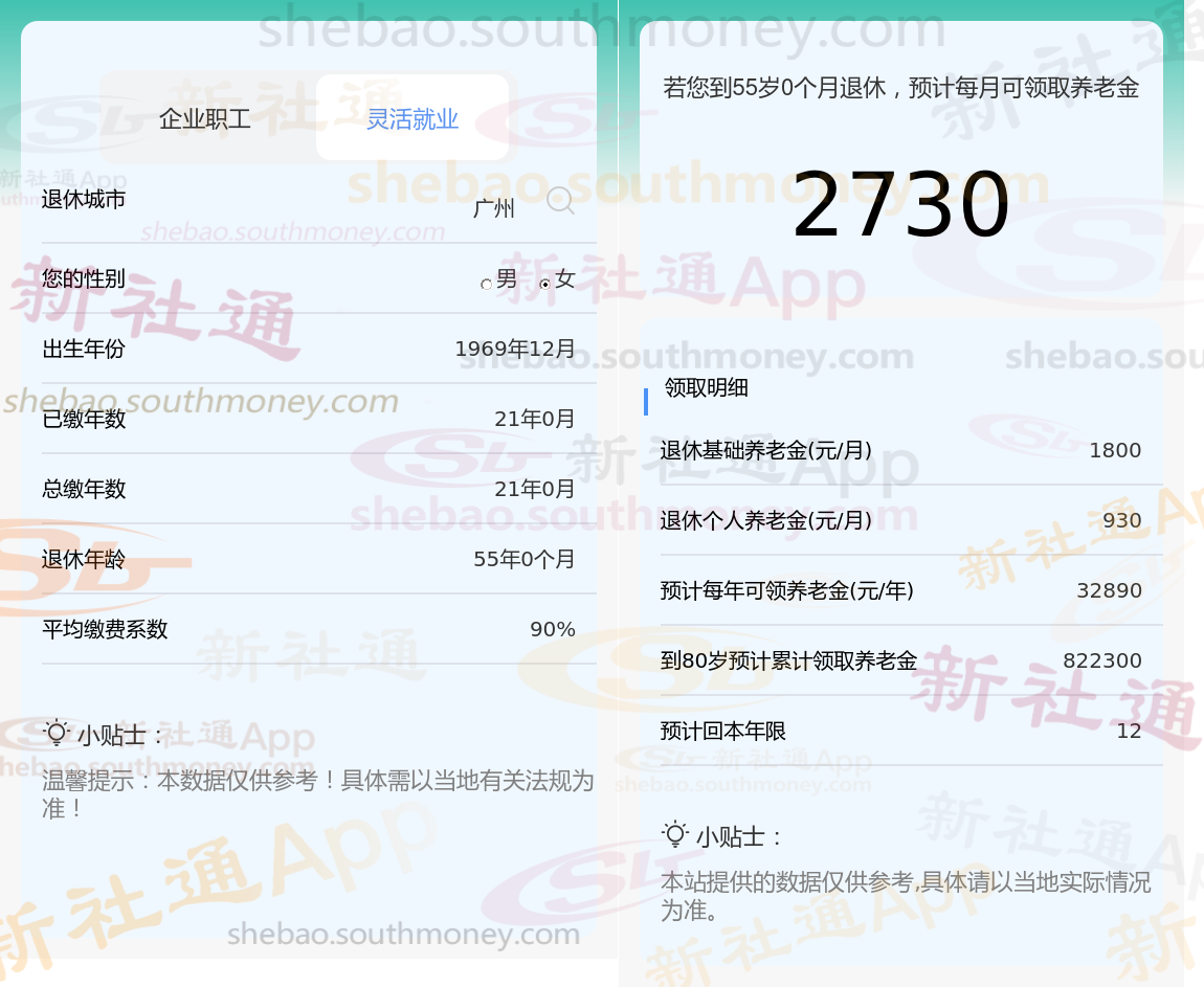 基于这些关键信息,我们使用新社通app养老金计算器对他未来的养老金进行了详细估算: