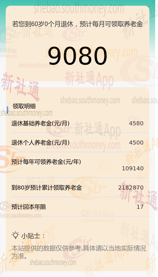 个人养老金计算结果:将上述数据代入公式,得出朱某的个人养老金为每月约4500元。