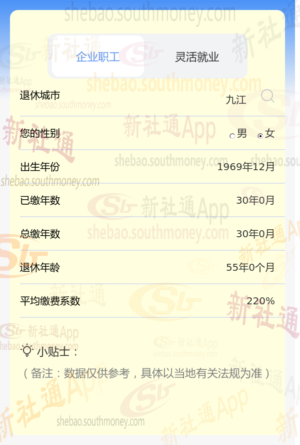 社保按220%档次缴费的谢某,九江城市退休,出生于1969年,工龄30年,女性。岁月流转,她终于迎来了自己的退休年龄。