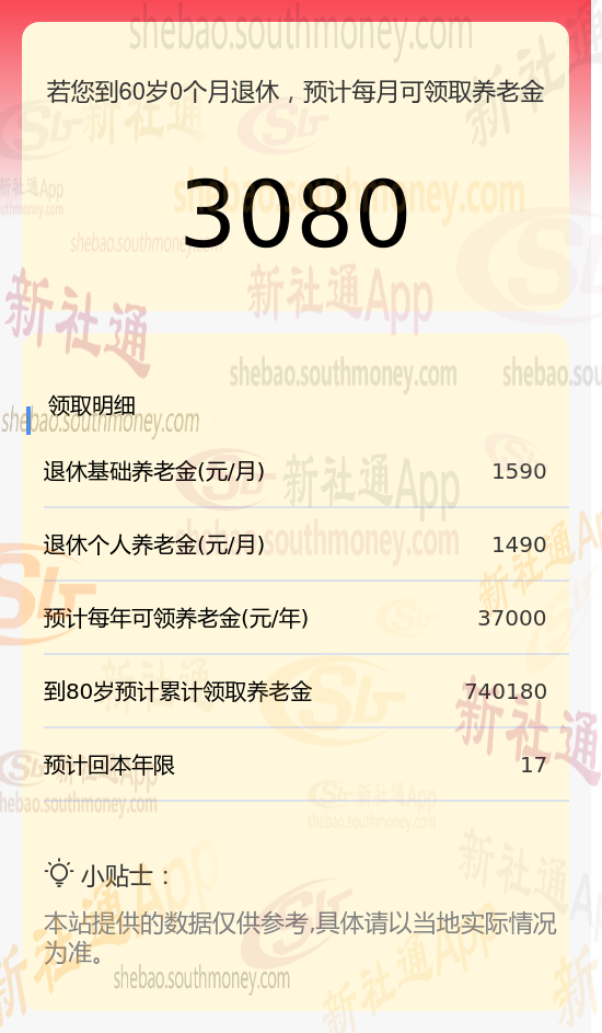 孔某,拥有长达16年的养老保险缴纳年限,其缴费档次一直维持在较高的200%水平。基于这些详细信息,我们使用了新社通app养老金计算器,并参考了当前的养老保险法规,对他未来的养老金进行了如下估算:
