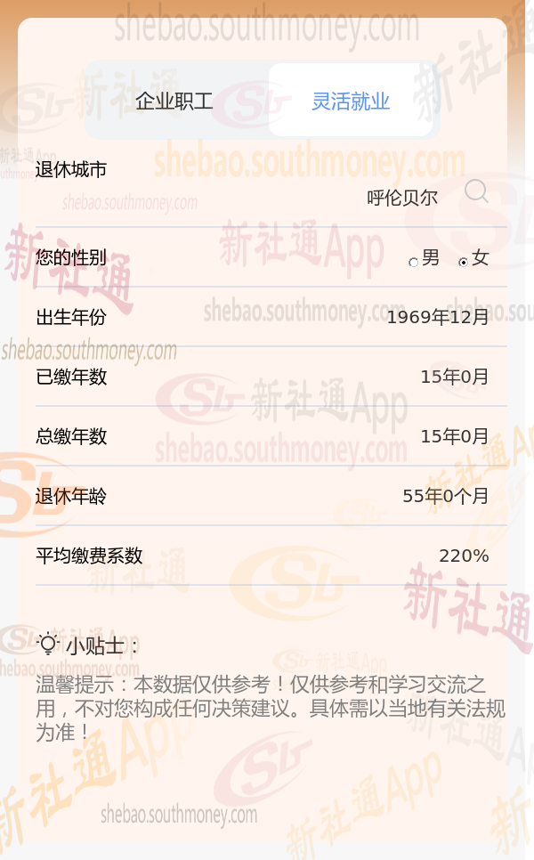 和社保网小编一起看个例子,呼伦贝尔工龄15年养老退休金如何计算?