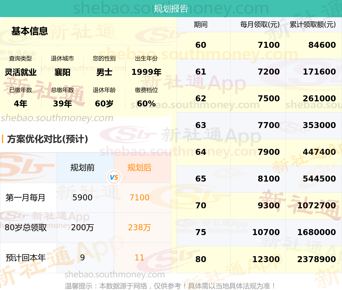 规划前:60岁第一个月约领5900元,新社通APP-养老金规划后:60岁第一个月约领7100元