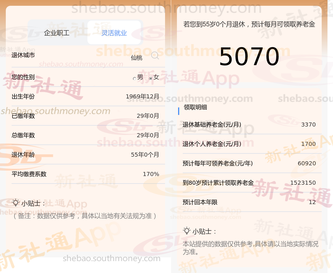 希某,女,1969年出生,现居仙桃并已退休。其养老保险缴纳情况如下:总缴费年限为29年,缴费档次达到170%。根据新社通app养老金计算器的估算结果: