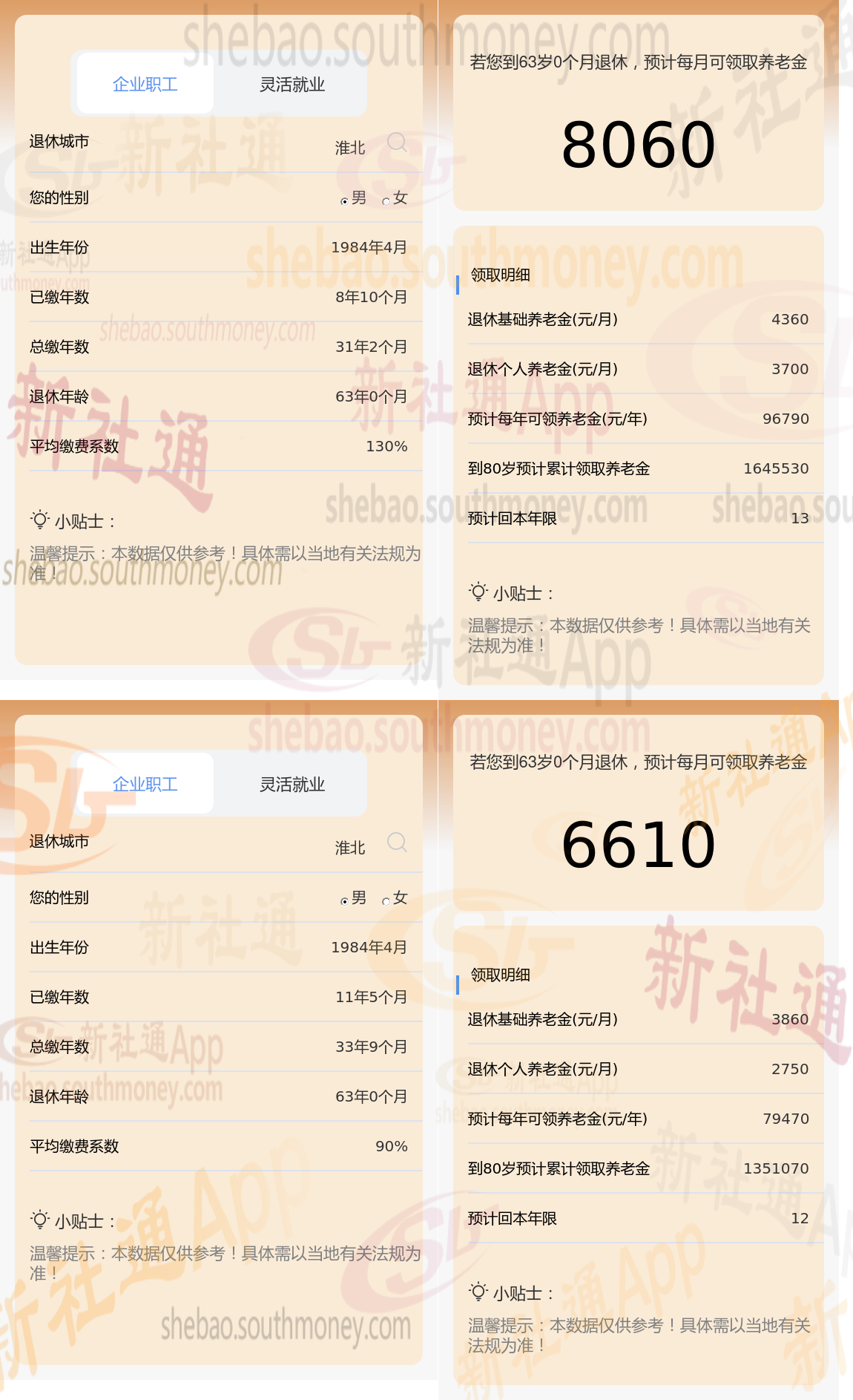 根据新社通app养老金计算器,轻松测算您的养老金!计算结果显示,朱某与老周的养老金差距源于缴费年限和缴费档位的差异,这一差距具体体现在数额上,朱某的8060元减去老周的6610元,等于1450元。