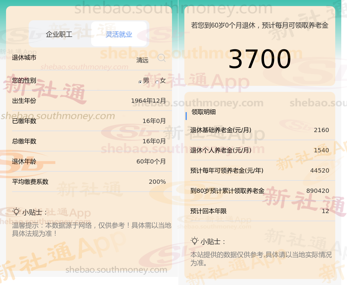 张某,作为一位勤勉的职工,他的养老保险缴纳记录长达16年之久,且缴费档次一直保持在较高的200%水平。基于这些关键数据,我们利用新社通app养老金计算器,结合最新的养老保险法规,对其养老金进行了如下估算: