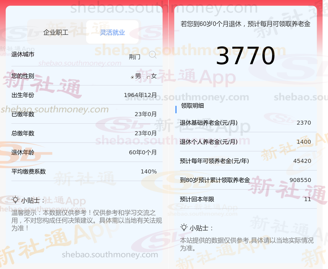 退休城市:荆门,性别:男,出生年份:1964,总缴年数23年,缴费档次:140%,新社通app养老金计算器所得: