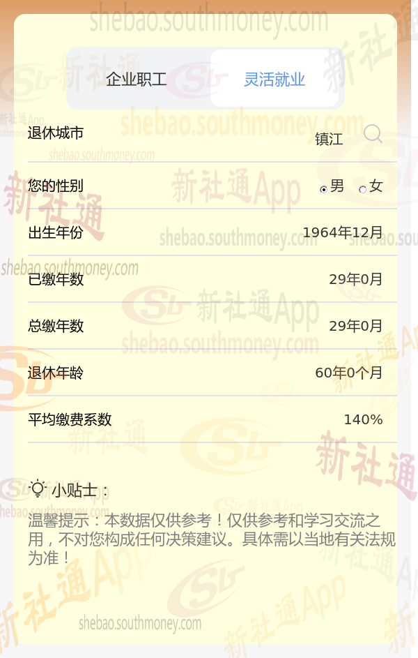 基础养老金:其计算公式为(全省上年度在岗职工月平均工资+本人指数化月平均缴费工资)÷2×缴费年限×1%。其中,本人指数化月平均缴费工资=全省上年度在岗职工月平均工资×本人平均缴费指数(本人平均缴费指数最高为300%,最低为60%,指数在0.6~3之间)。