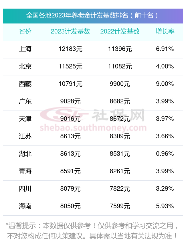 据新社通app显示,2023年上海位列第一位,养老金计发基数达到12183.00元,增长率为6.91%;北京排名第二,养老金计发基数为11525.00元,增长率为4.00%;西藏排名第三,养老金计发基数11010.00元,增长率为1.99%。排名前10的还有:广东(10791.00元,9.00%)、天津(9028.00元,3.99%)、湖北(9016.00元,3.97%)、江苏(8690.00元,2.00%)、青海(8613.00元,3.66%)、四川(8591.00元,0.96%)、海南(8141.00元,3.29%)。