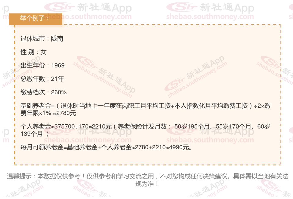 陇南的一位女性灵活就业退休人员向我们咨询了她的养老金问题。她出生于1969年,工龄为21年,且一直以来她的养老保险都是按照相对较高的260%档位进行缴纳的。她十分关心自己退休后每月能够领取的养老金数额,并询问我们,基于她的个人情况,她的养老金是否能超过4500元,以保证她退休后的生活质量。
