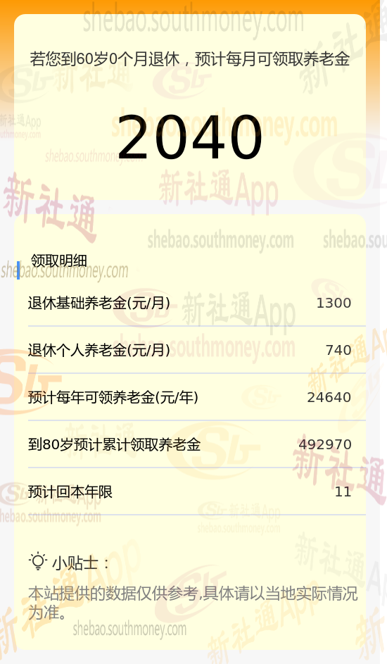 新社通app养老金计算器所得出,每月领取2040元养老金。