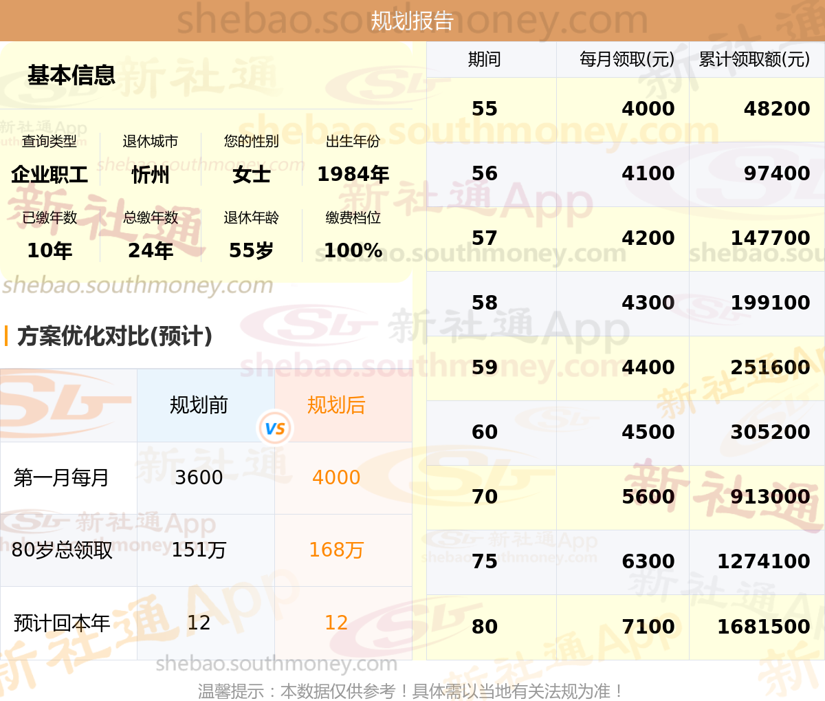 规划前:55岁约领3600元,新社通APP-养老金规划后:55岁约领4000元