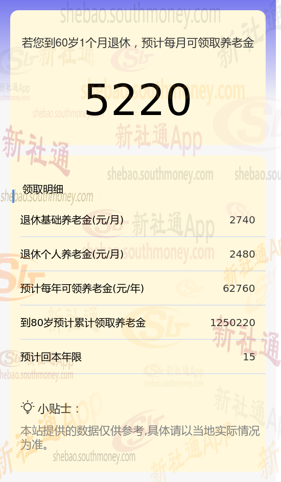每月可领养老金=基础养老金+个人养老金≈2740+2480≈5220元。