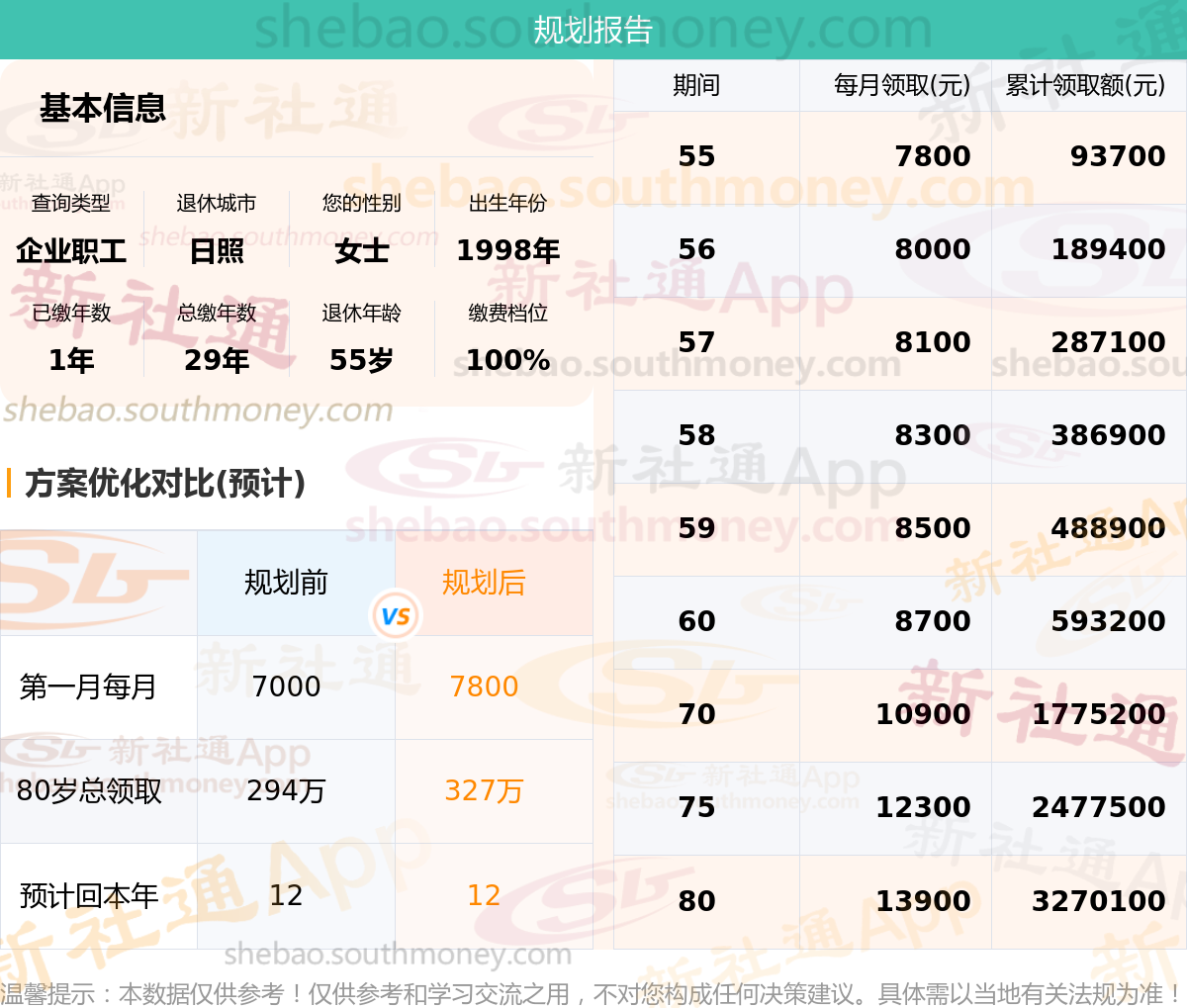 规划前:55岁第一个月约领7000元,新社通APP-养老金规划后:55岁第一个月约领7800元