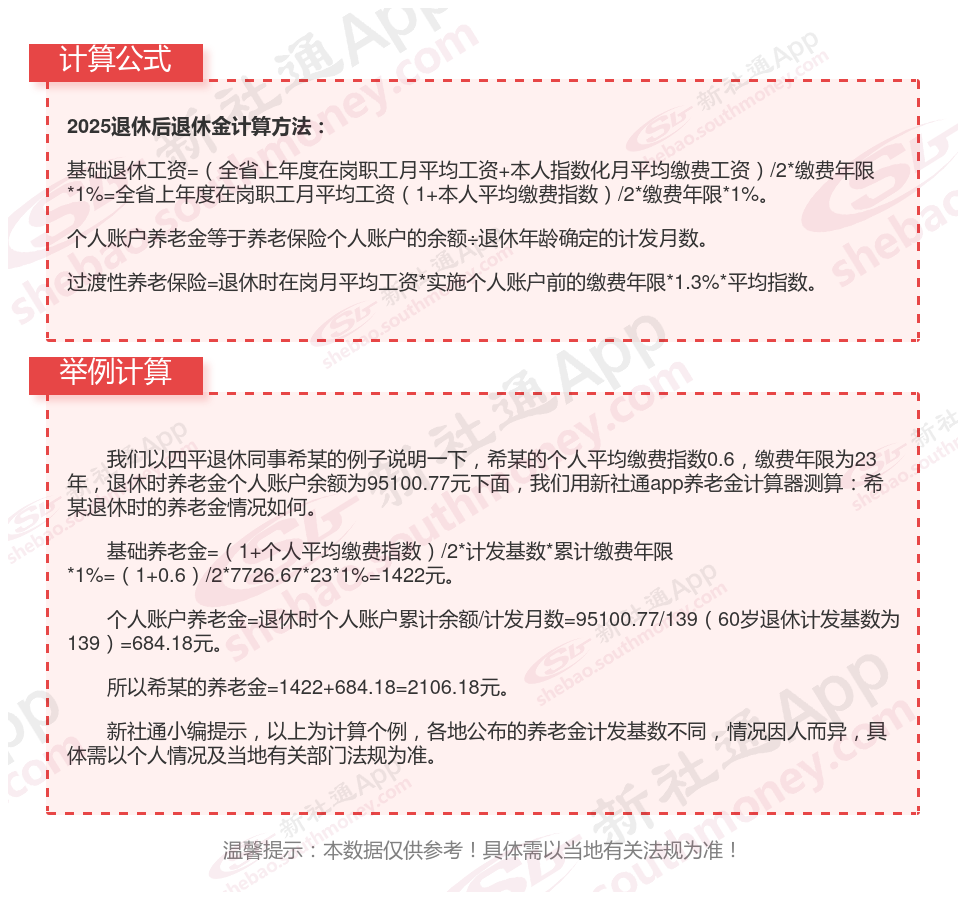 基础养老金计算公式为:(全省上年度在岗职工月平均工资+本人指数化月平均缴费工资)÷2×缴费期限×1%。