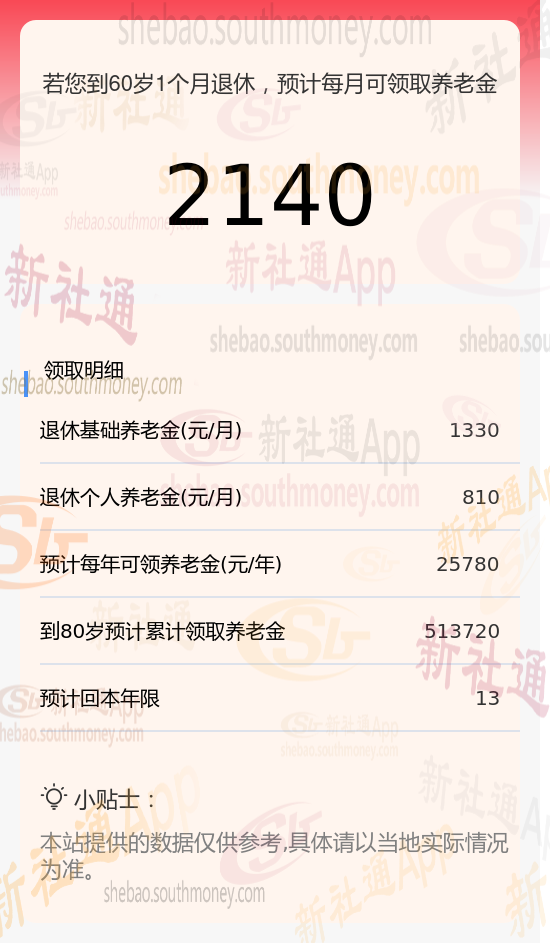 下面一起来分享个例子:朋友张某,社保缴纳21年要退休了,按70%档位缴纳,估算每月领取大约会比1600元多。每月能够领取的养老金是多少?
