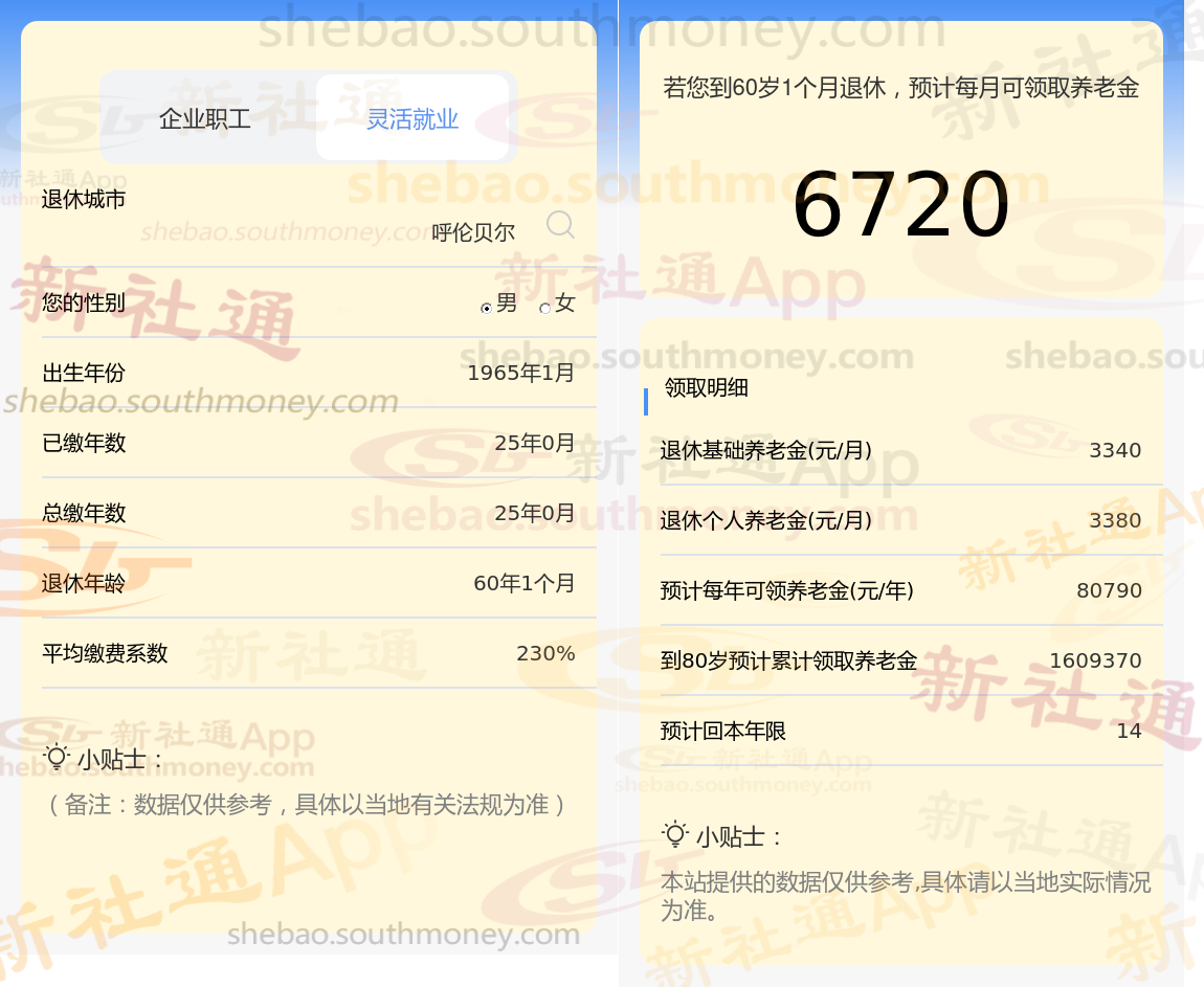 朋友夏某退休城市在呼伦贝尔,性别:男,出生年份:1965,总缴年数25年,缴费档次:230%,新社通app养老金计算器所得: