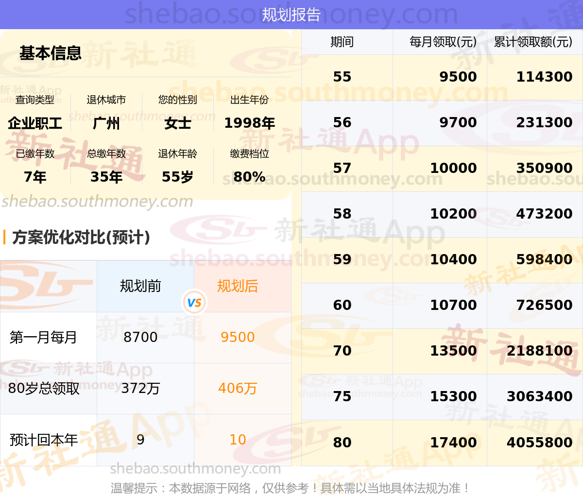 规划前:参保城市:广东广州,性别:女士,出生年月:1998,已缴年限:7年,总缴年数:35年,退休年龄:55岁,缴费档位:80%。