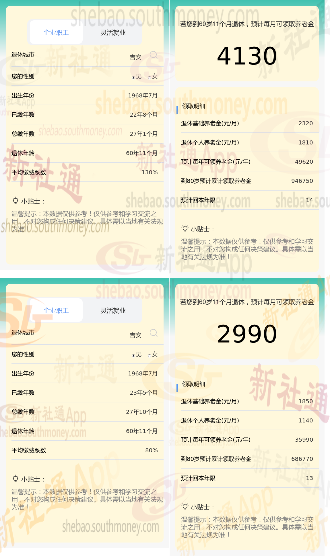 根据新社通app养老金计算器,轻松测算您的养老金!经过计算发现,柯某与老方的在养老金上的差异,主要是由于他们的缴费年限和缴费档位不同所导致的。具体来说,两者的养老金差额达到了1140元,即柯某的4130元减去老方的2990元。