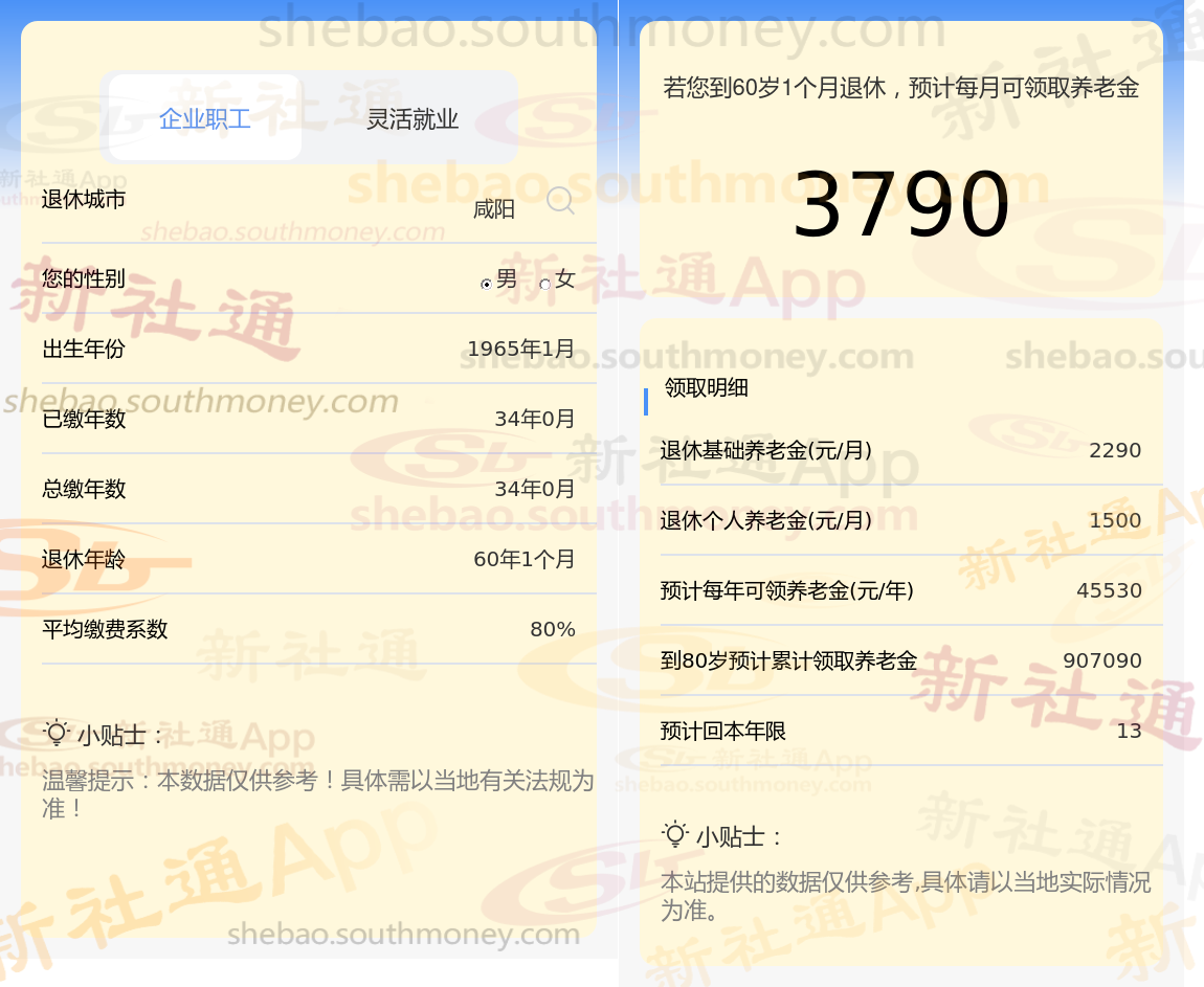笔友林某退休城市在咸阳,性别:男,出生年份:1965,总缴年数34年,缴费档次:80%,新社通app养老金计算器所得: