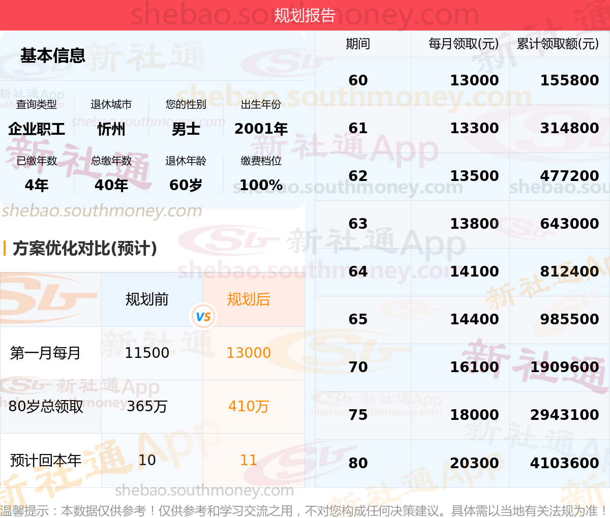 规划前:参保城市:山西忻州,性别:男士,出生年月:2001,已缴年限:4年,总缴年数:40年,退休年龄:60岁,缴费档位:100%。
