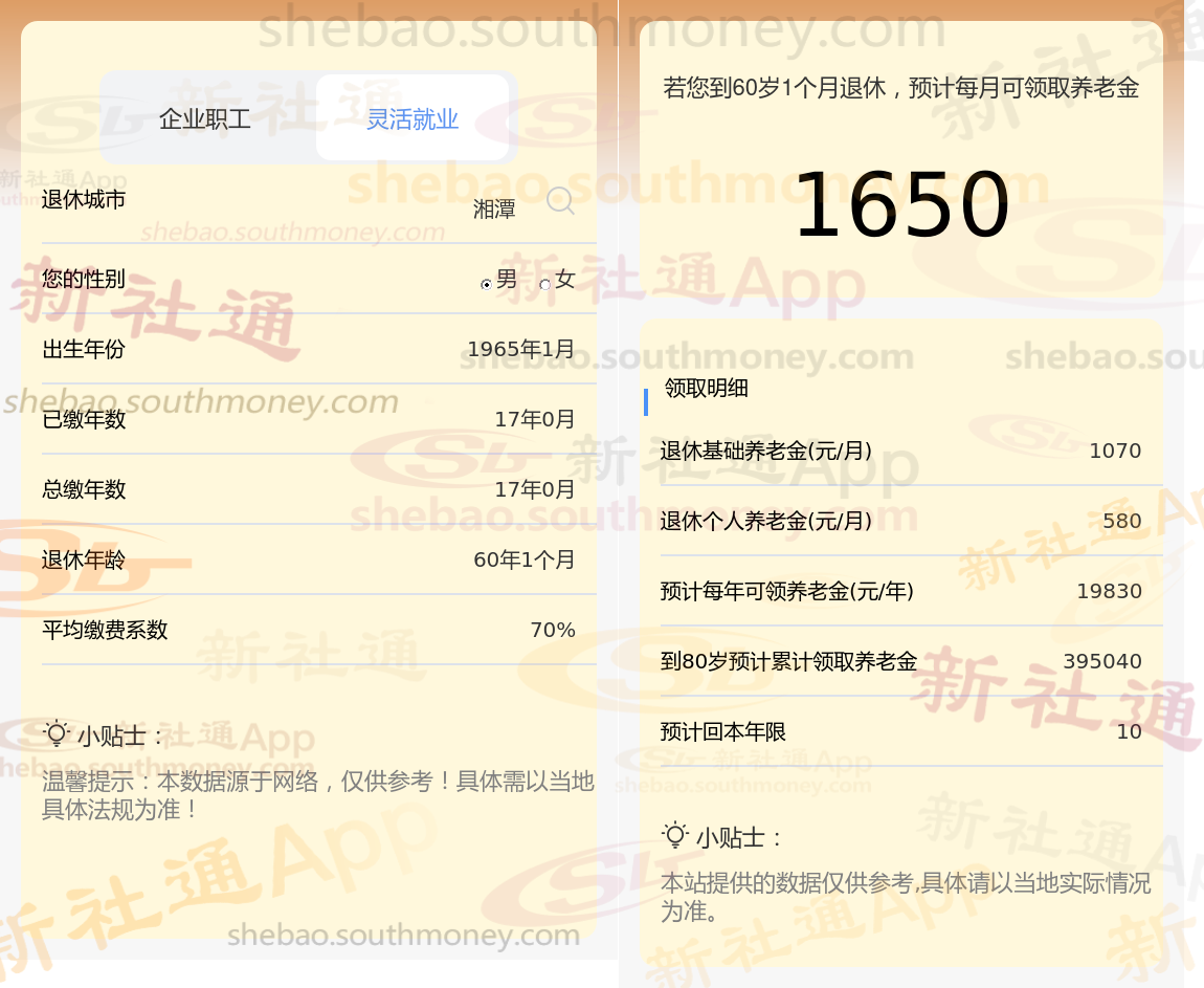 退休城市:湘潭,性别:男,出生年份:1965,总缴年数17年,缴费档次:70%,新社通app养老金计算器所得: