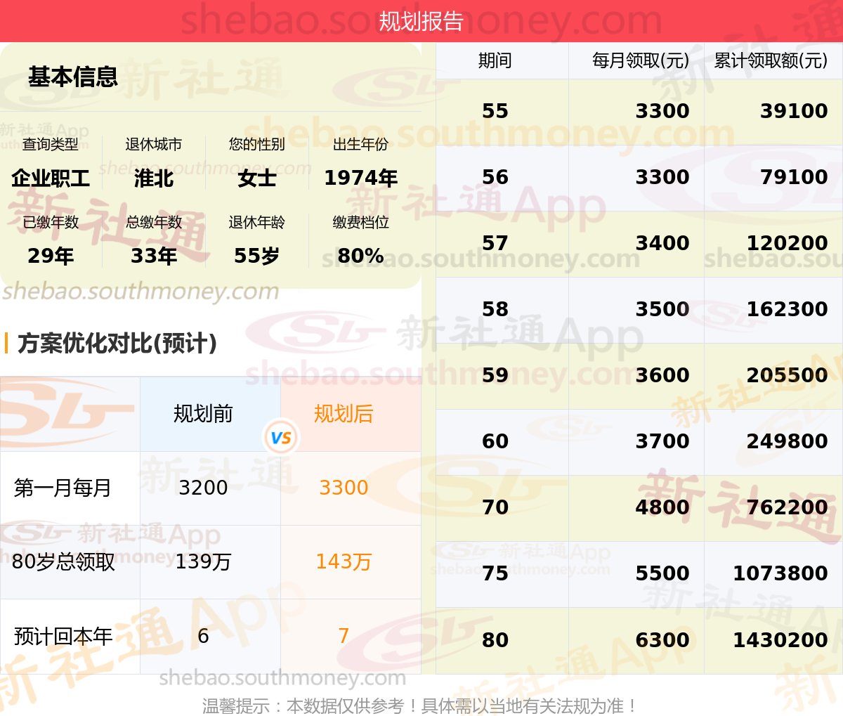 规划后:55岁退休金=基础养老金+个人账户养老金根据社保网app计算出每月养老金为3300元。
