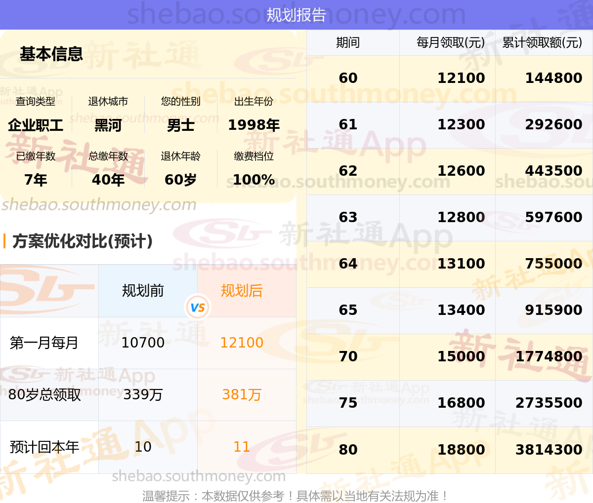 规划前:60岁第一个月约领10700元,新社通APP-养老金规划后:60岁第一个月约领12100元