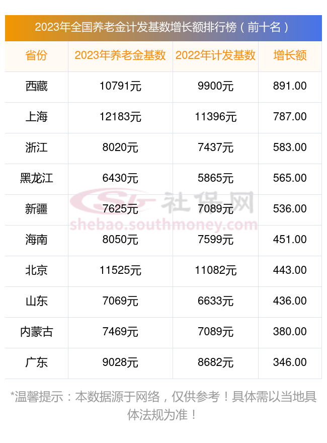 2023年最新养老金计发基数增长额排行榜前几位的情况如何呢?