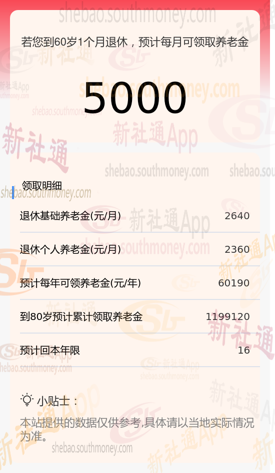 新社通app养老金计算器计算所得: