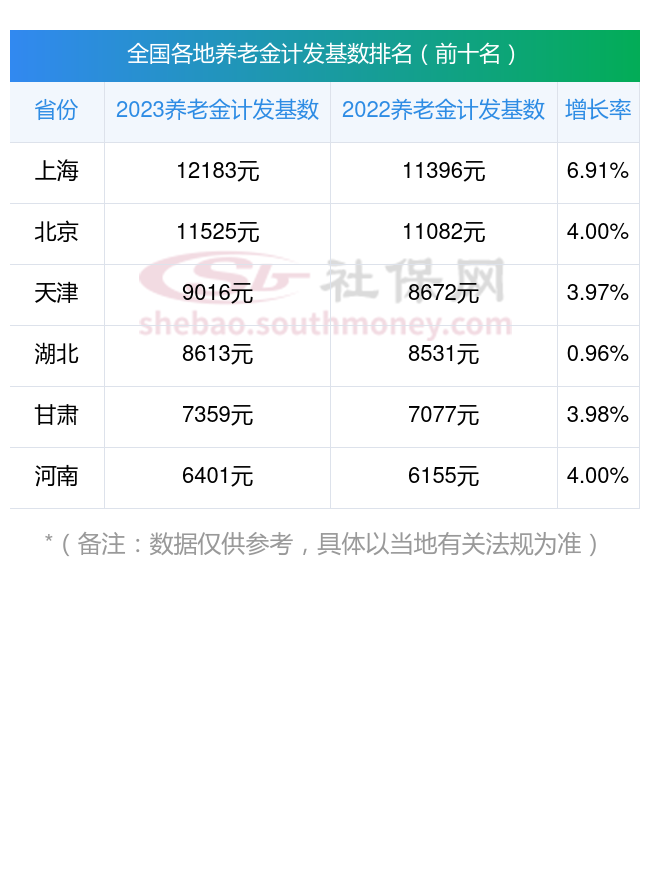 据新社通app显示,2023年上海位列第一位,养老金计发基数达到12307.00元,增长率为1.02%;北京排名第二,养老金计发基数为12183.00元,增长率为6.91%;西藏排名第三,养老金计发基数11883.00元,增长率为3.11%。排名前10的还有:广东(11546.00元,7.00%)、天津(11525.00元,4.00%)、青海(11010.00元,1.99%)、江苏(9307.00元,3.09%)、湖北(9232.00元,2.40%)、新疆(9016.00元,3.97%)、四川(8878.00元,3.34%)。