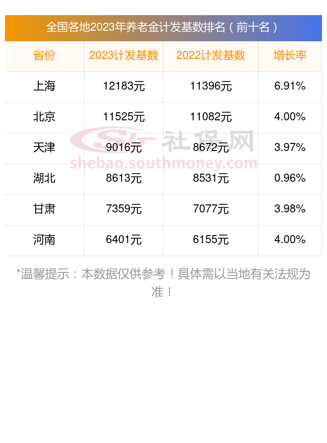 北京排名第二,养老金计发基数为12183.00元,增长率为6.91%;