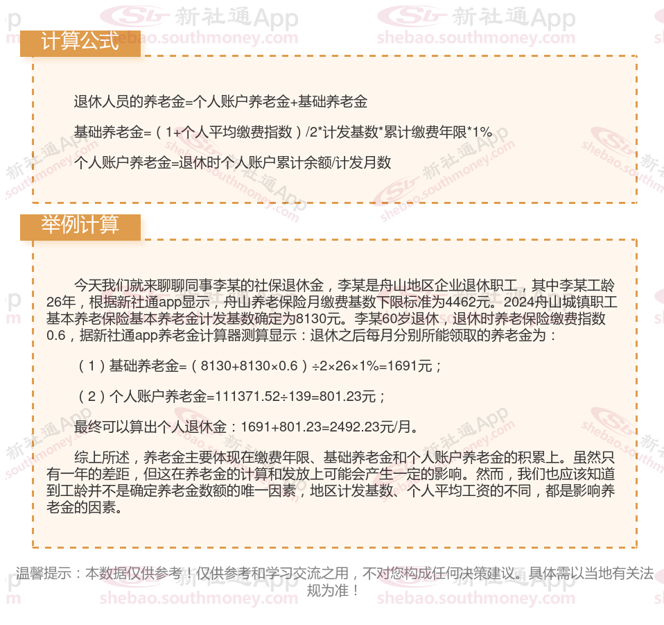 基础养老金计算公式为:(全省上年度在岗职工月平均工资+本人指数化月平均缴费工资)÷2×缴费期限×1%。
