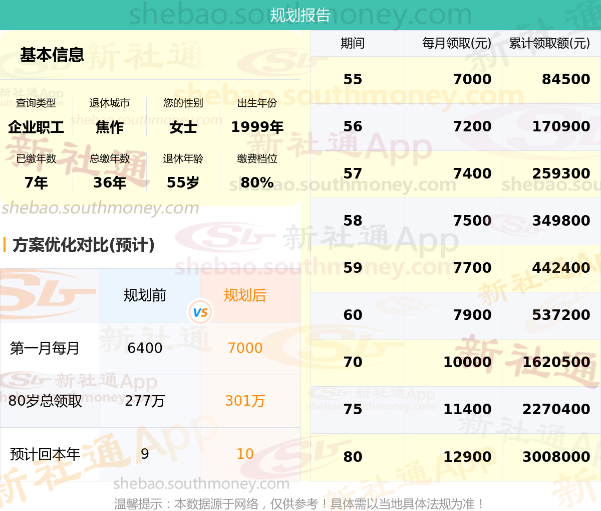 规划前:55岁第一个月约领6400元,新社通APP-养老金规划后:55岁第一个月约领7000元