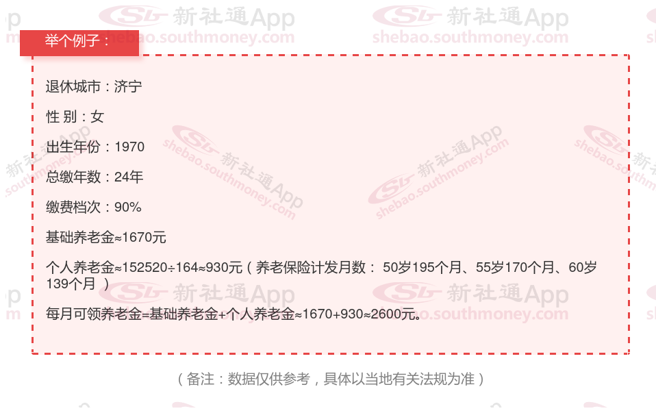 退休城市:济宁,性别:女,出生年份:1970,总缴年数24年,缴费档次:90%,新社通app养老金计算器所得: